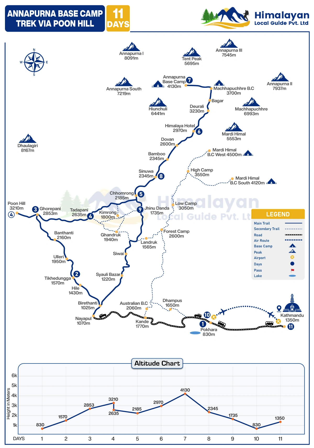 This trek takes you through a different assortment of high elevations. The minimum altitude is around 830 meters at Pokhara to a maximum of 4130 meters at Annapurna Base Camp. As we travel along the journey route, ascending and descending, it allows for acclimatization and minimizes the possibility of Acute Mountain Sickness (AMS). Even though you must take care of high-altitude sickness and alleviate the risk, get plenty of rest, drink more water, sleep, and eat a balanced diet.