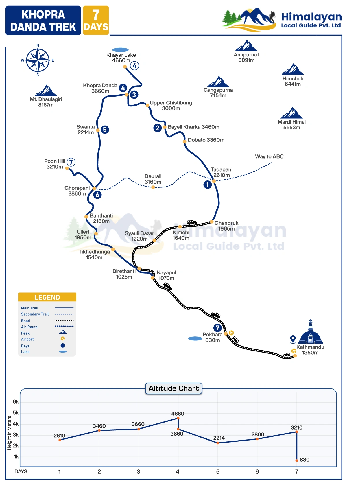 Khopra Danda Trek - 7 Days is a newly opened trekking route in the Annapurna Himalaya. The trek takes us off the beaten trails with magnificent views of Mt. Dhaulagiri, Tukche Peak, Nilgiri Himal, Annapurna South, Hiuchuli, Machhapuchhare (Fishtails 6993m), rural villages, and millets and rice fields.