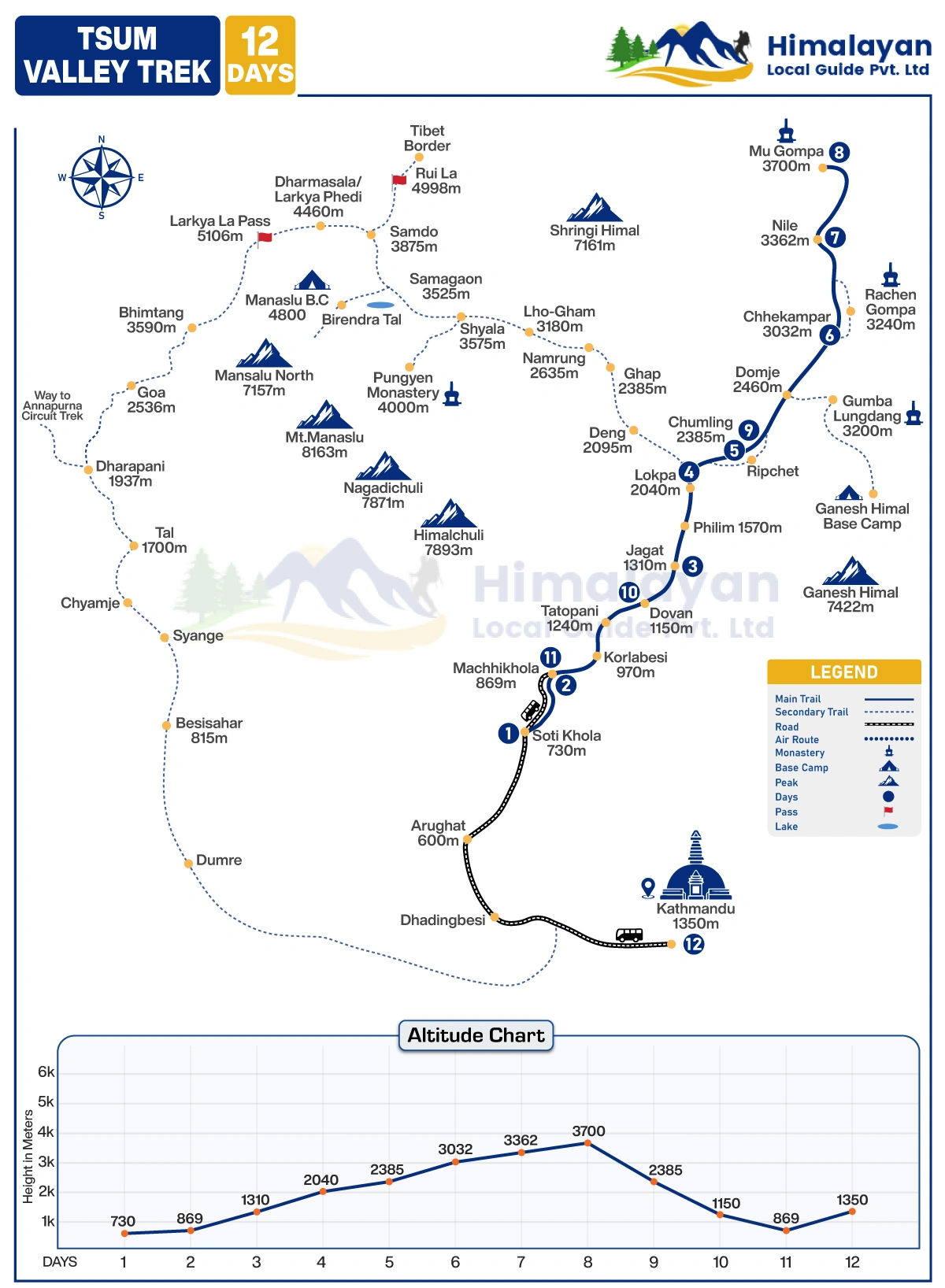 12 - Day Tsum Valley Trek Itinerary covers the Manaslu region. Which is the nearby border of Tibet, and gets to travel around Buddhism with an unbelievable culture and history.