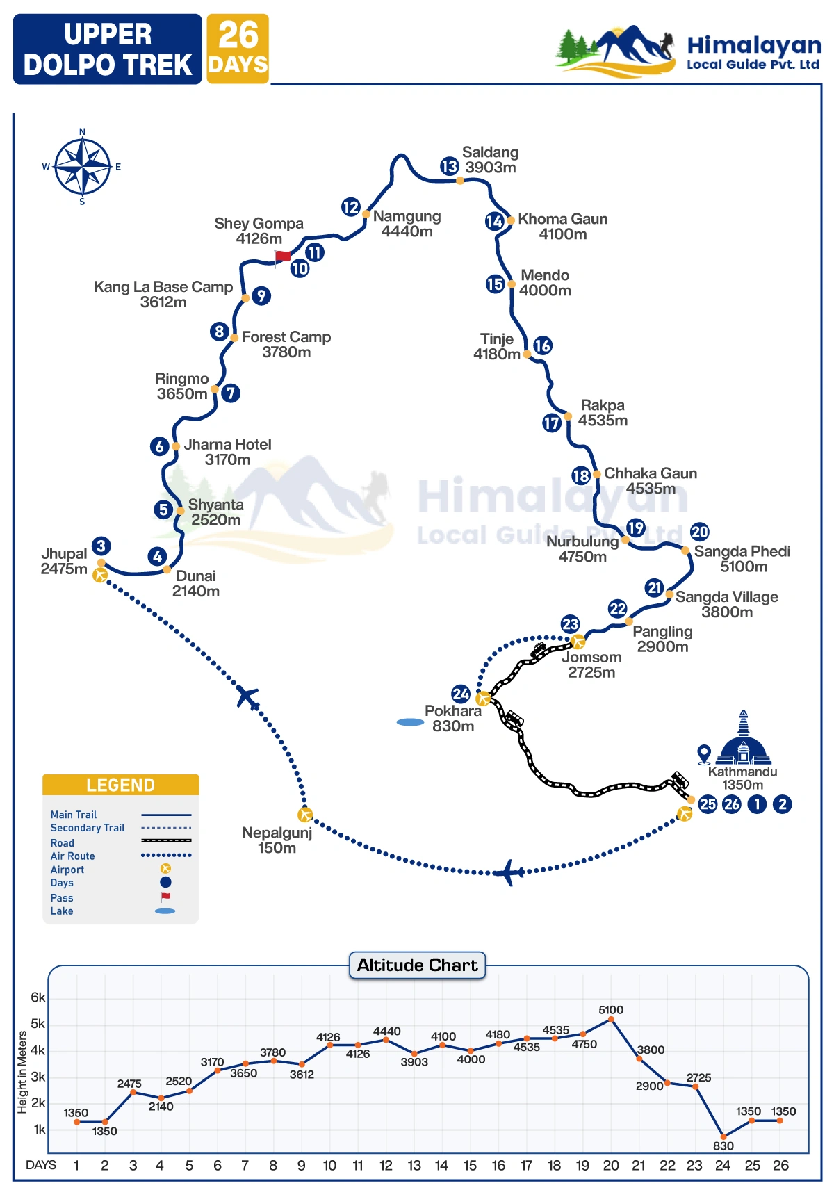 Our local trekking guided to Upper Dolpo trek itinerary starts from the capital city of Kathmandu with a scenic short flight to Jhuphal and takes a step through local villages of the Limb, Rai, Gurung, and Chhetri trekking routes where we get the chance to explore the some of our time with local people in a village in the Himalayas region.