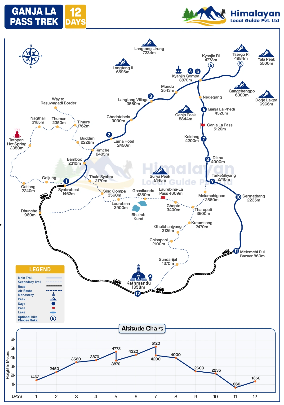 The main highest point of Ganja La pass Trek is 5120 meters.