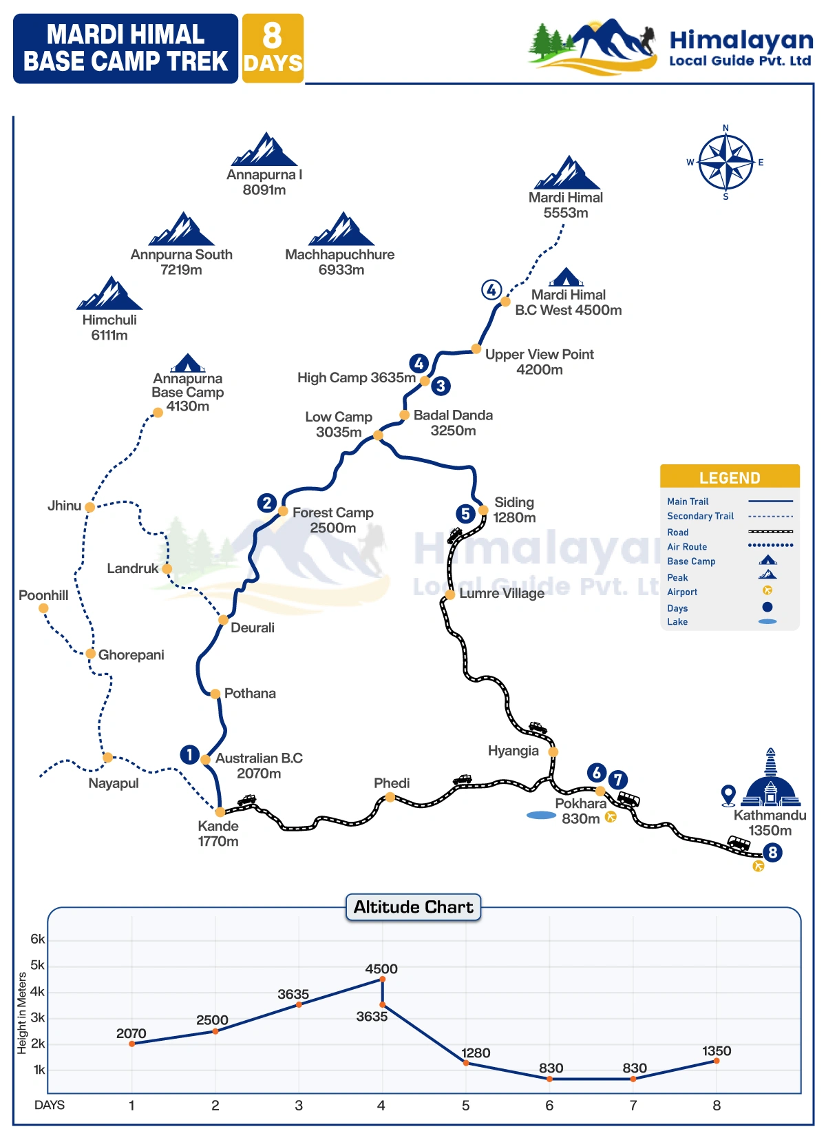 Mardi Himal Base Camp Trek Itinerary, we drive to Kande by car or van, which is take around 30 minutes, then after, we passing the wonderful typical traditional and local culture village-like, Australian Camp, Pothana, Deaurali, forest camp, high camp, Mardi Himal Base Camp and Siding, you will travel around the gems of the Himalayas in the journey after than we drive back to Pokhara.
